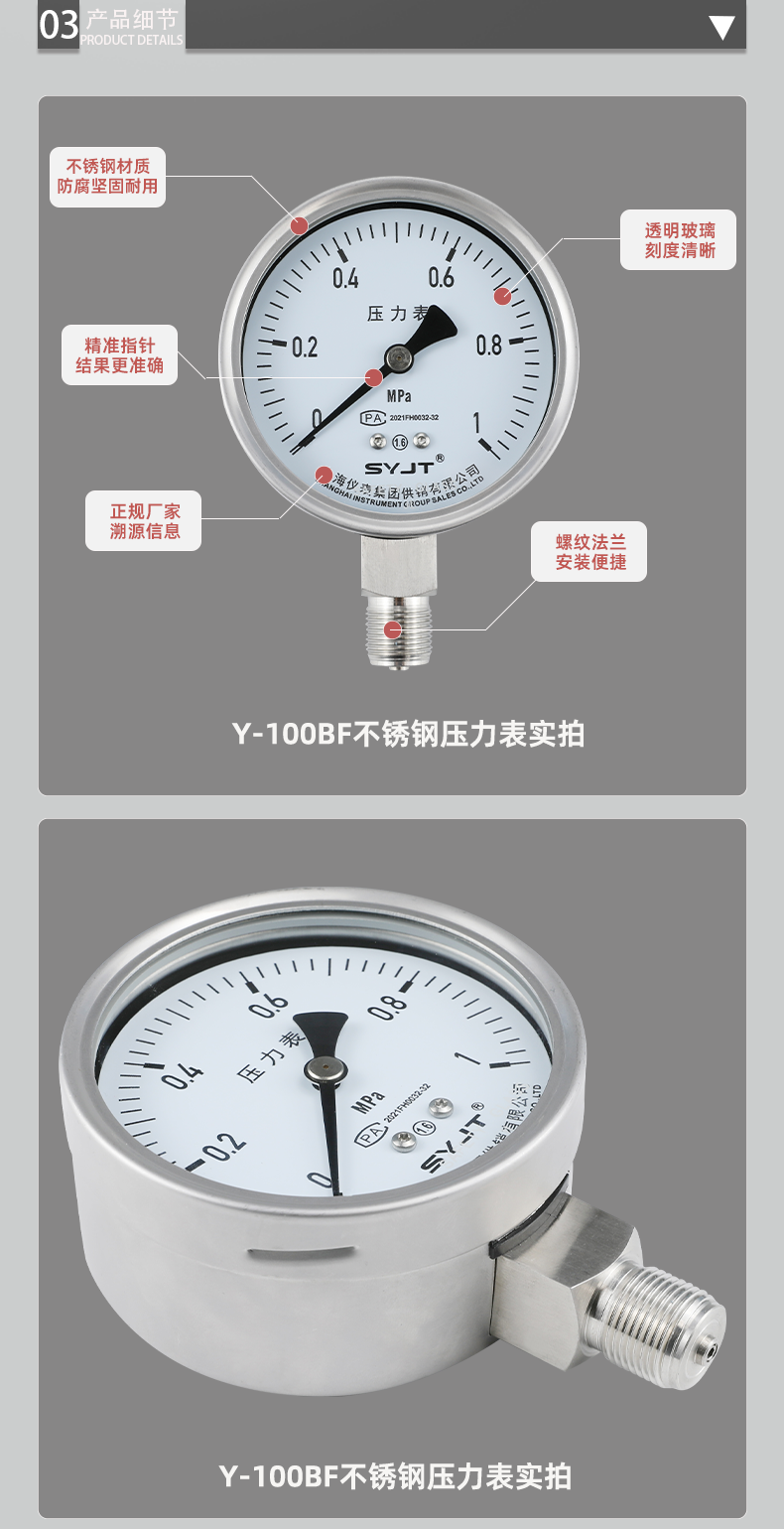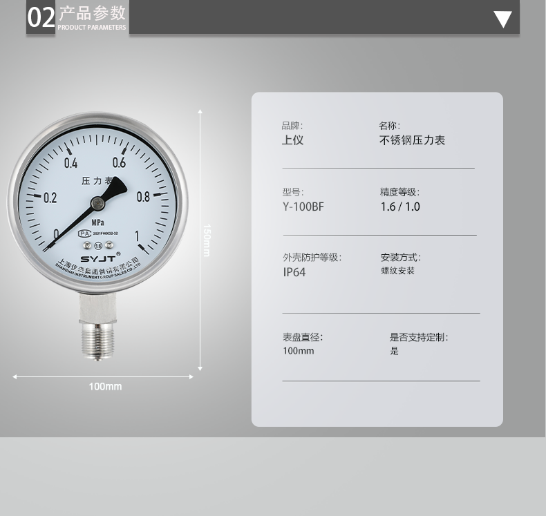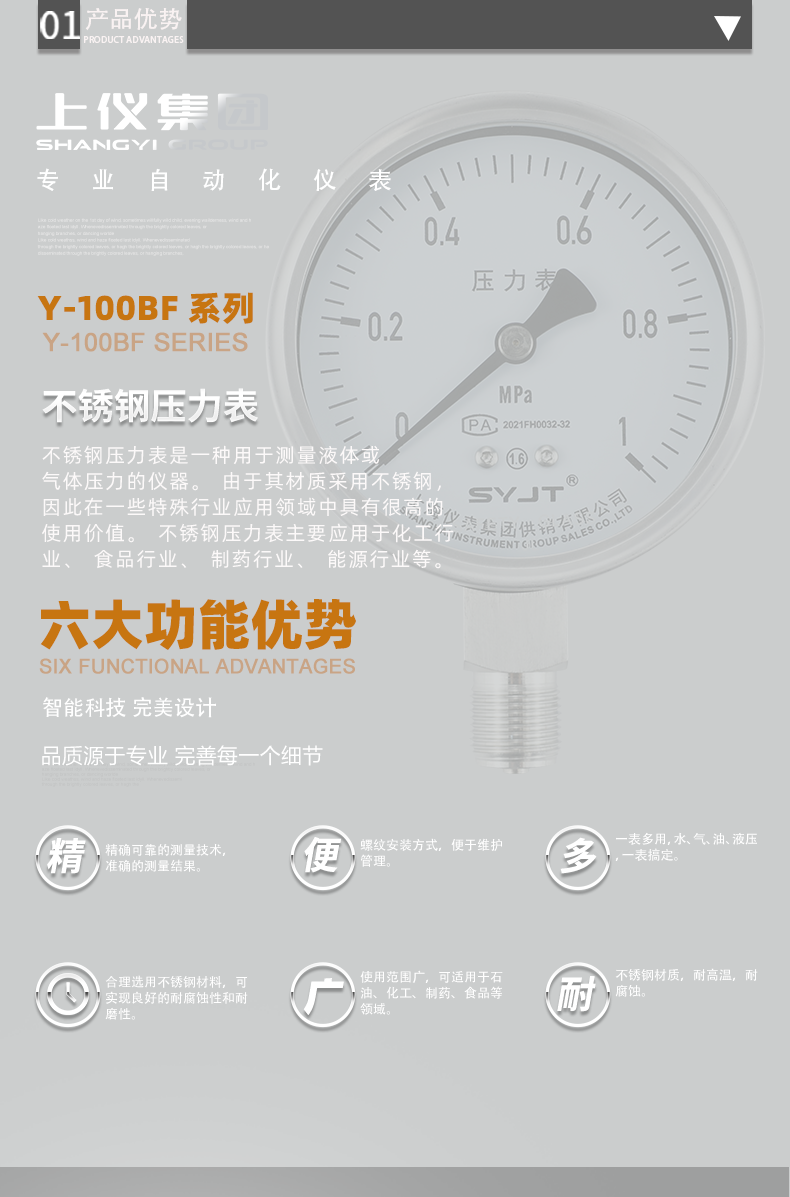 上儀Y-100BF不銹鋼壓力表不銹鋼壓力表廣泛用于石油、化工、化纖、冶金、電站等工業(yè)部門中對耐腐、抗振有較高要求的工藝流程中測量各種流體介質(zhì)的壓力。