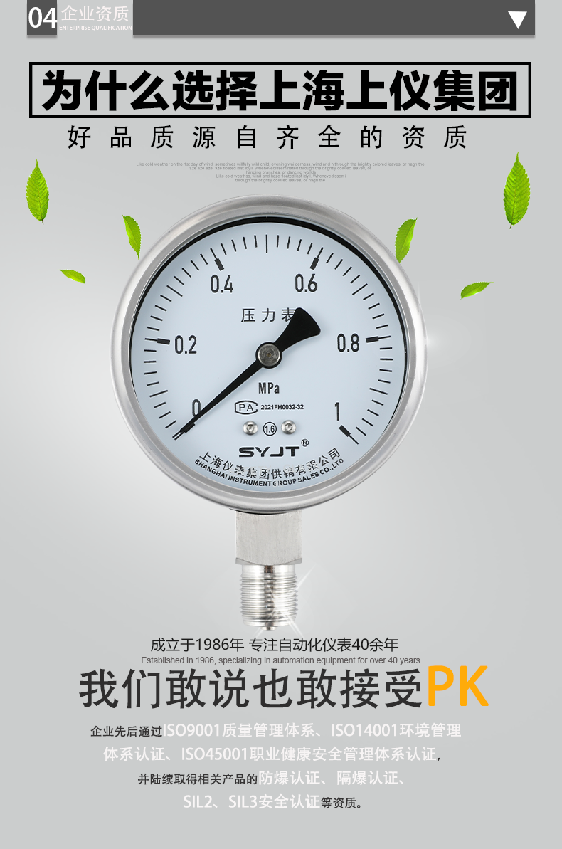 上儀Y-100BF不銹鋼壓力表的整體結(jié)構(gòu)設(shè)計(jì)合理、工藝精致,具有較高的測量**度和持久的穩(wěn)定性,因此不僅可提供出口,尤為國內(nèi)用戶對引進(jìn)國外先進(jìn)技術(shù)裝備中的同類儀表實(shí)現(xiàn)國產(chǎn)化的理想配套產(chǎn)品。