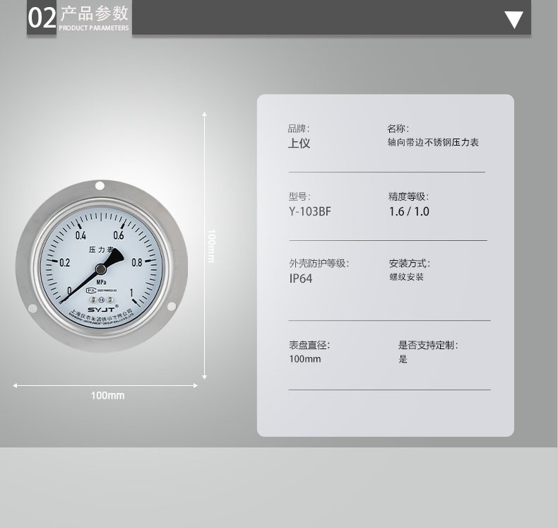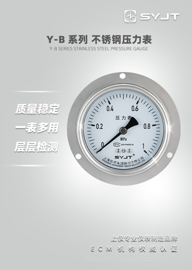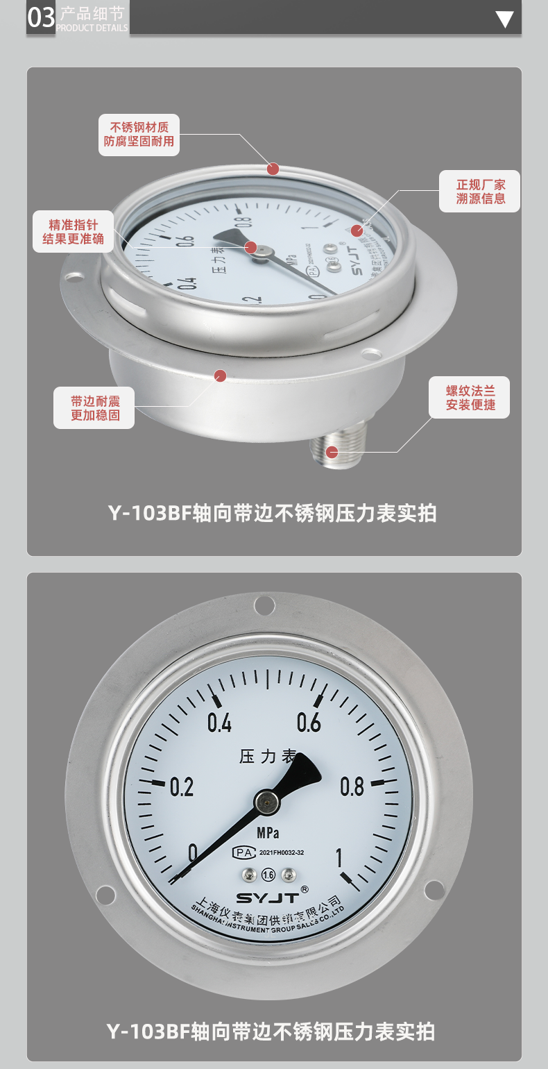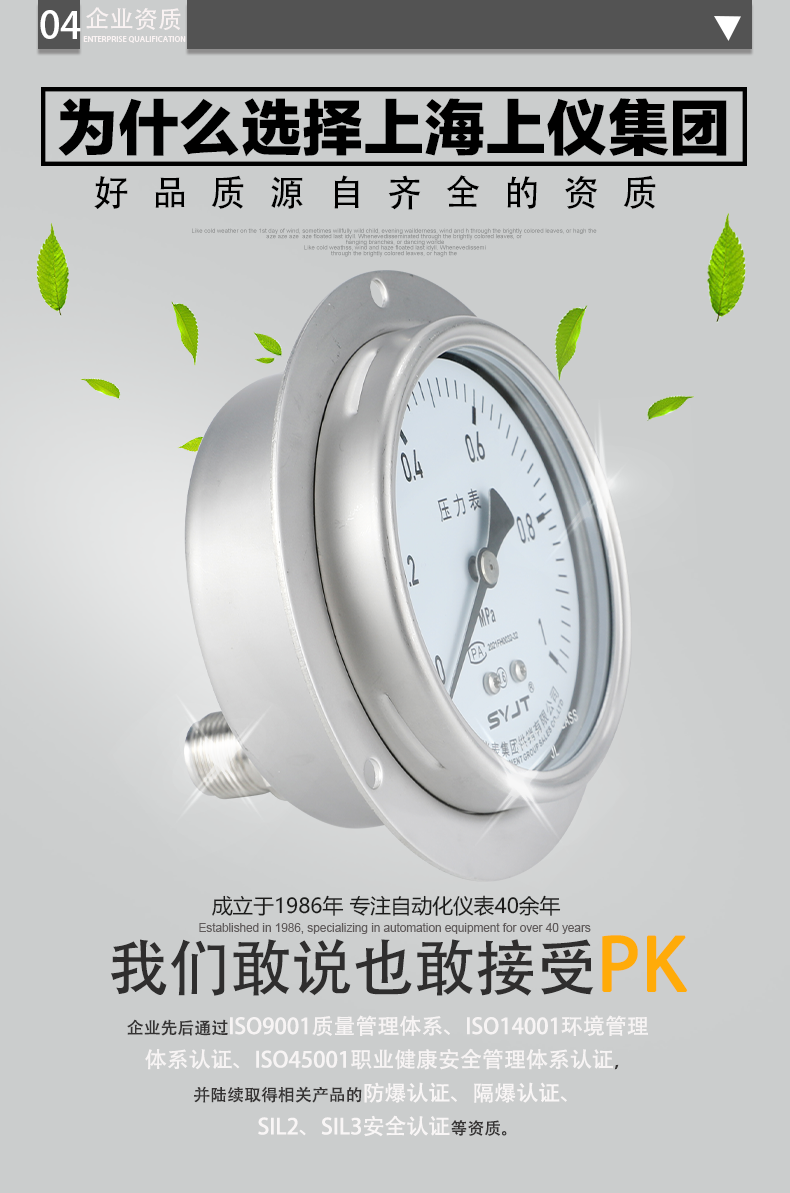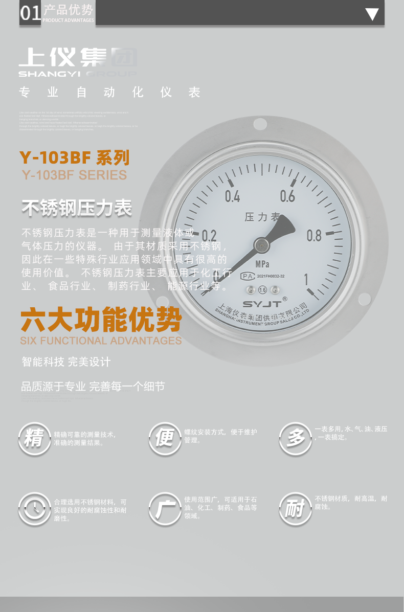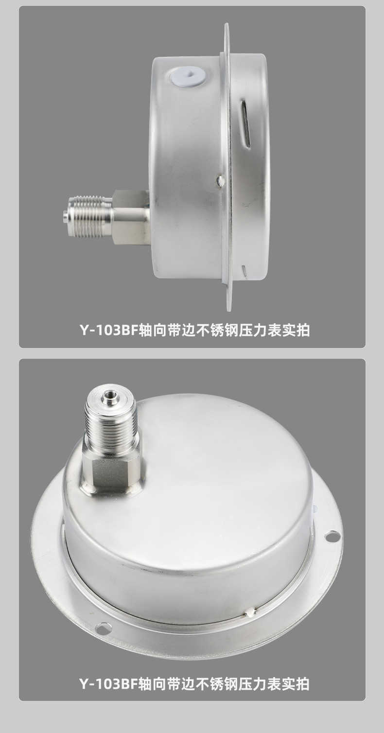 上儀集團(tuán)Y-103BF軸向帶邊不銹鋼壓力表,不銹鋼壓力表廣泛用于石油、化工、化纖、冶金、電站等工業(yè)部門中對耐腐、抗振有較高要求的工藝流程中測量各種流體介質(zhì)的壓力。