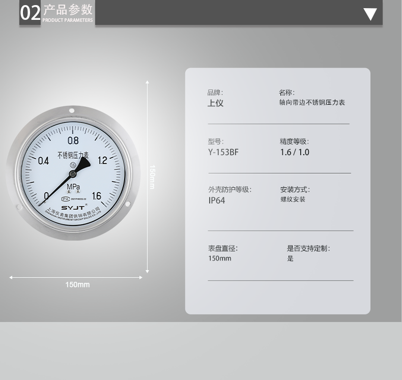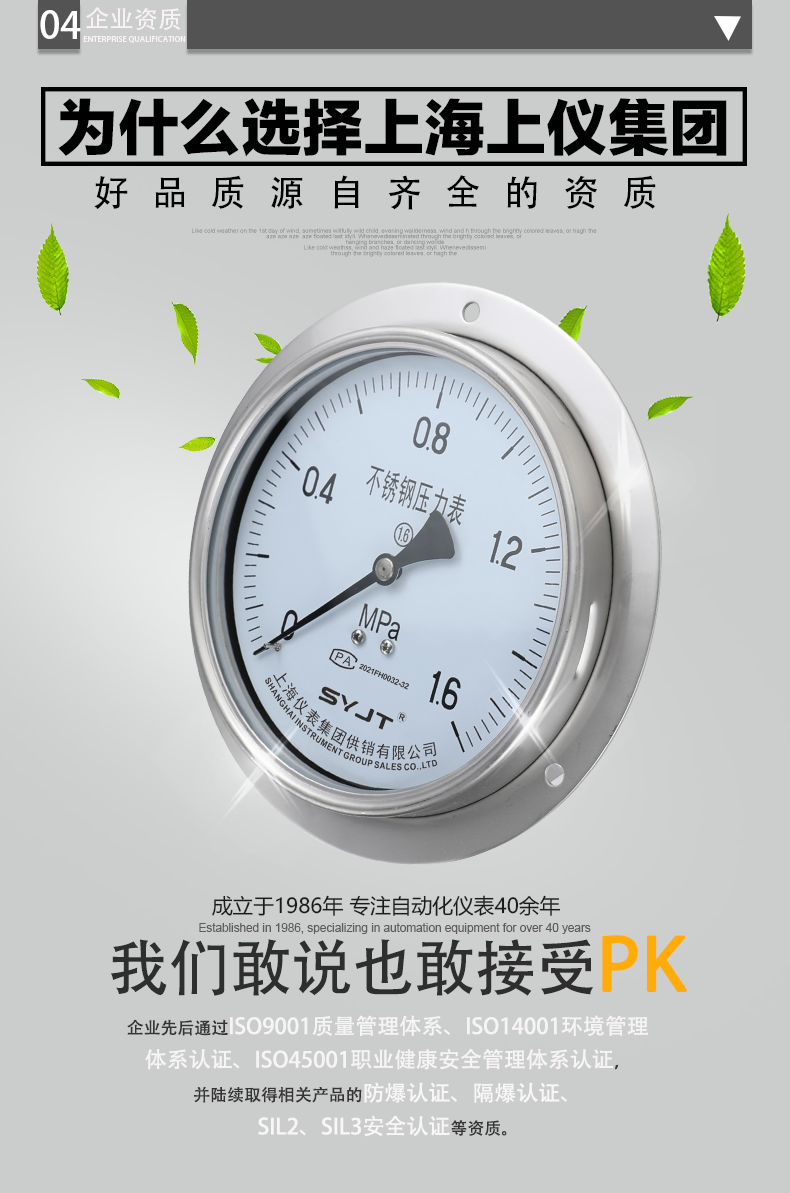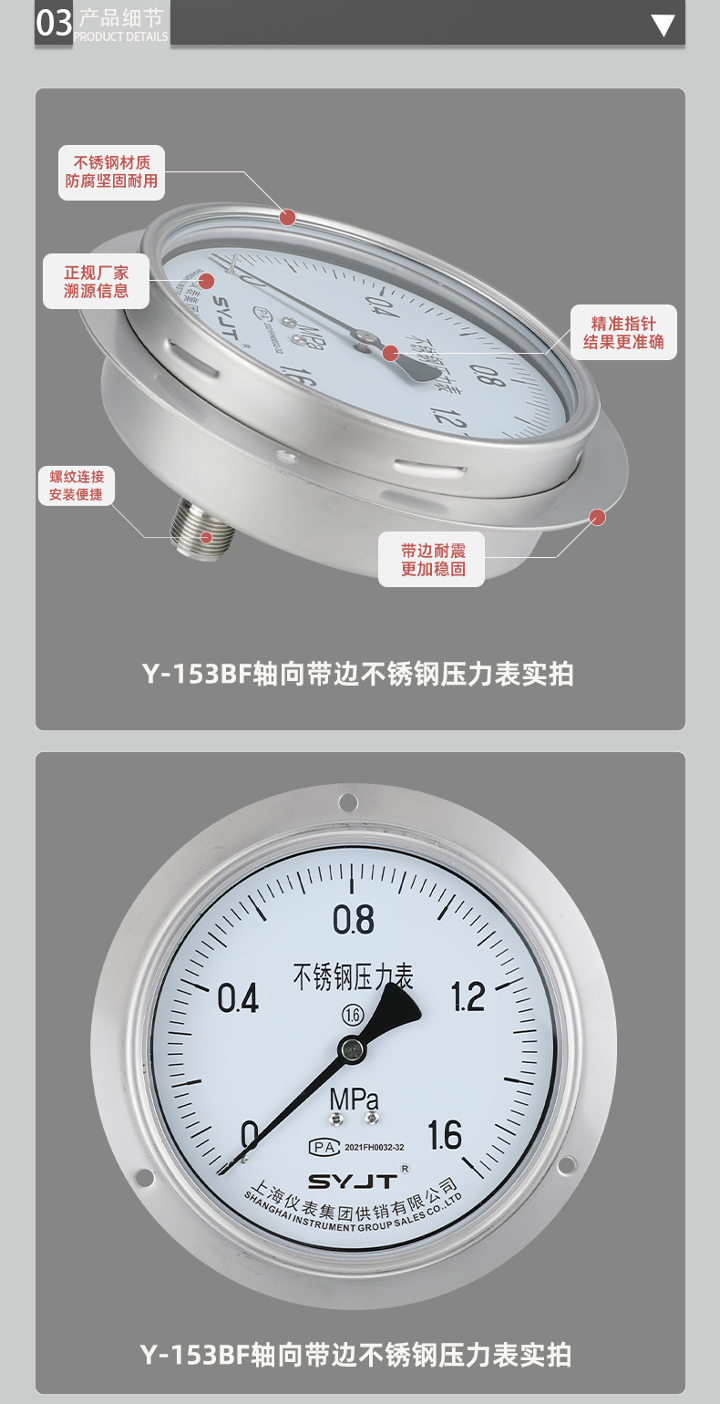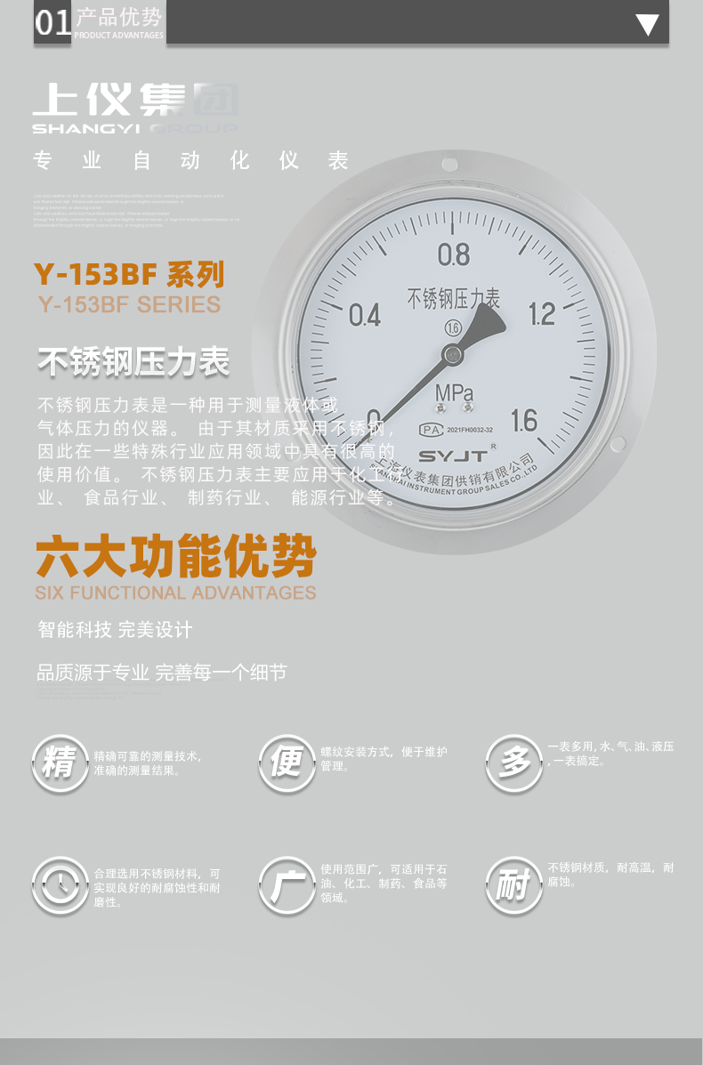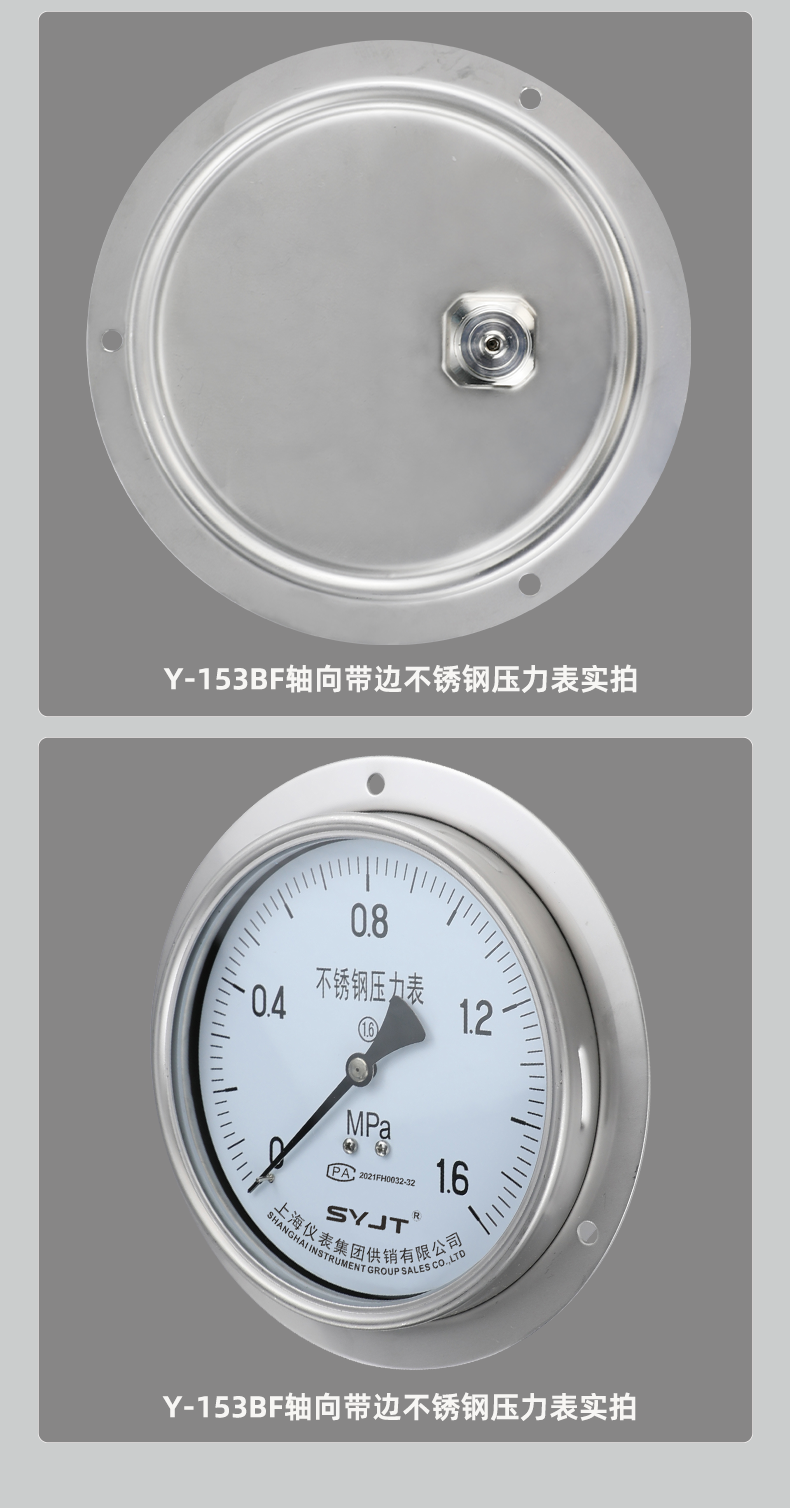 上儀集團(tuán)Y-153BF軸向帶邊不銹鋼壓力表,不銹鋼壓力表廣泛用于石油、化工、化纖、冶金、電站等工業(yè)部門中對耐腐、抗振有較高要求的工藝流程中測量各種流體介質(zhì)的壓力。