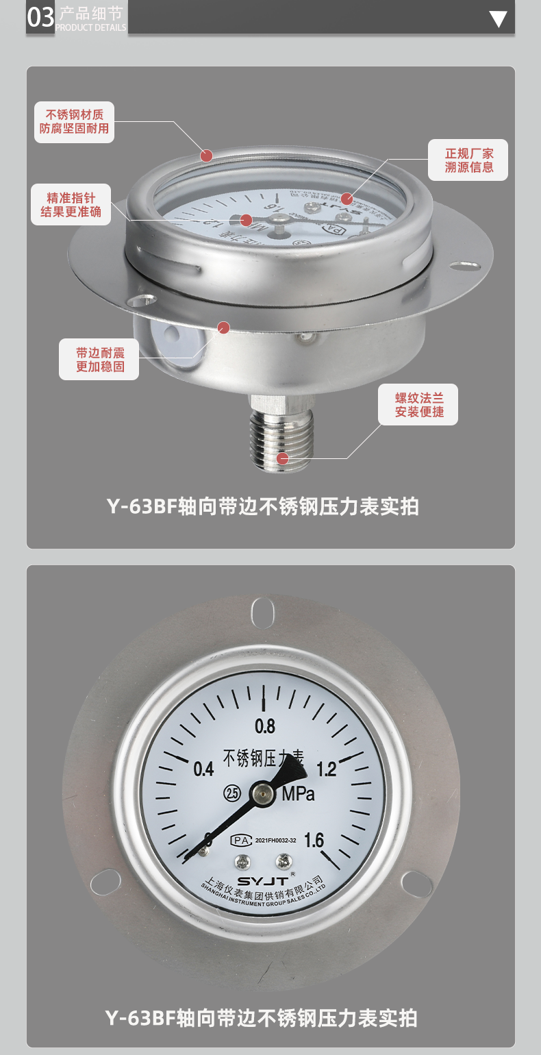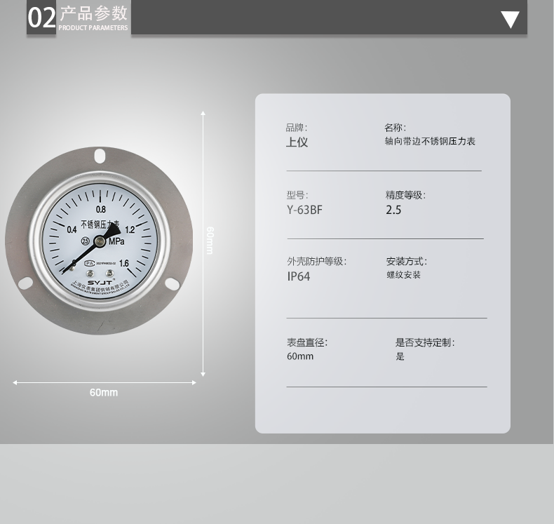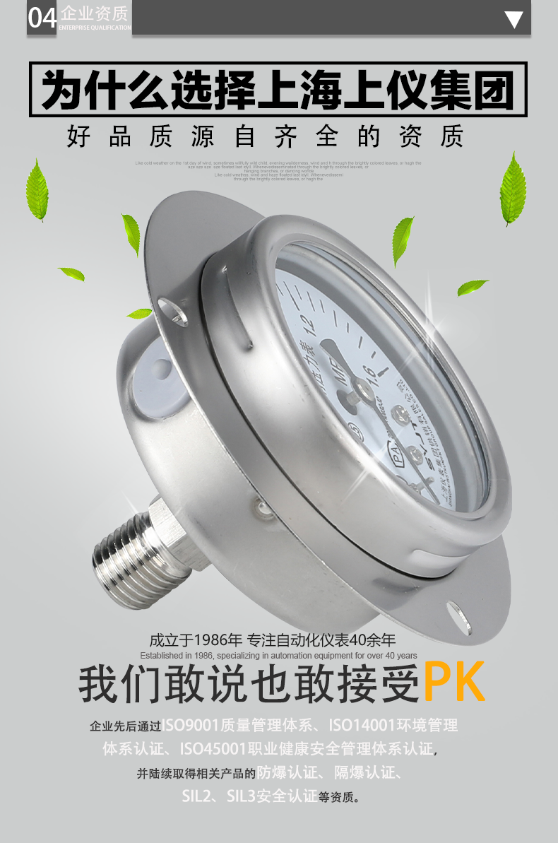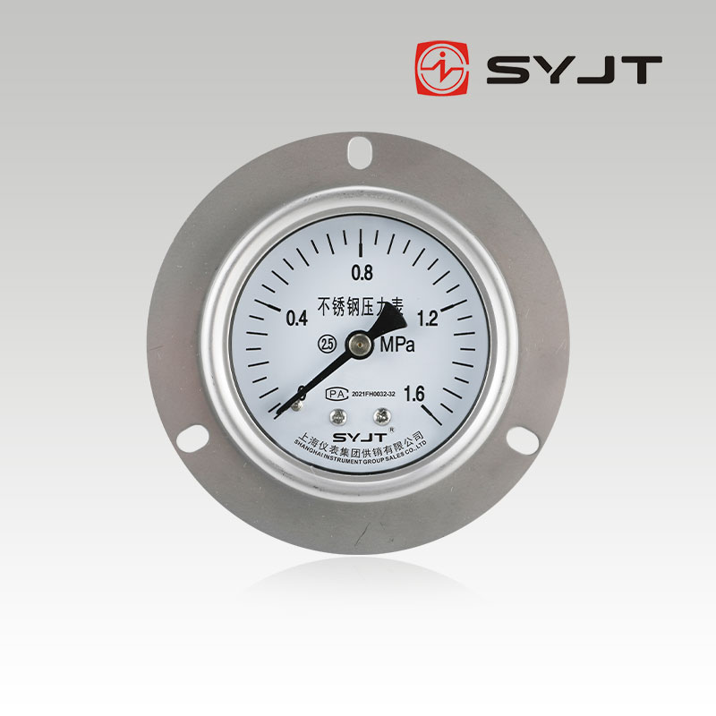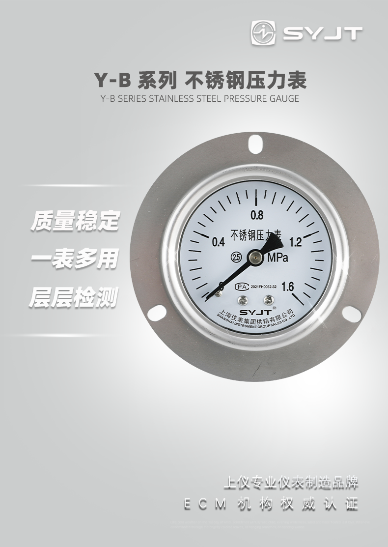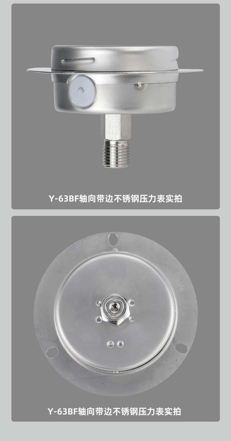 上儀集團Y-63BF軸向帶邊不銹鋼壓力表,不銹鋼壓力表廣泛用于石油、化工、化纖、冶金、電站等工業(yè)部門中對耐腐、抗振有較高要求的工藝流程中測量各種流體介質的壓力。