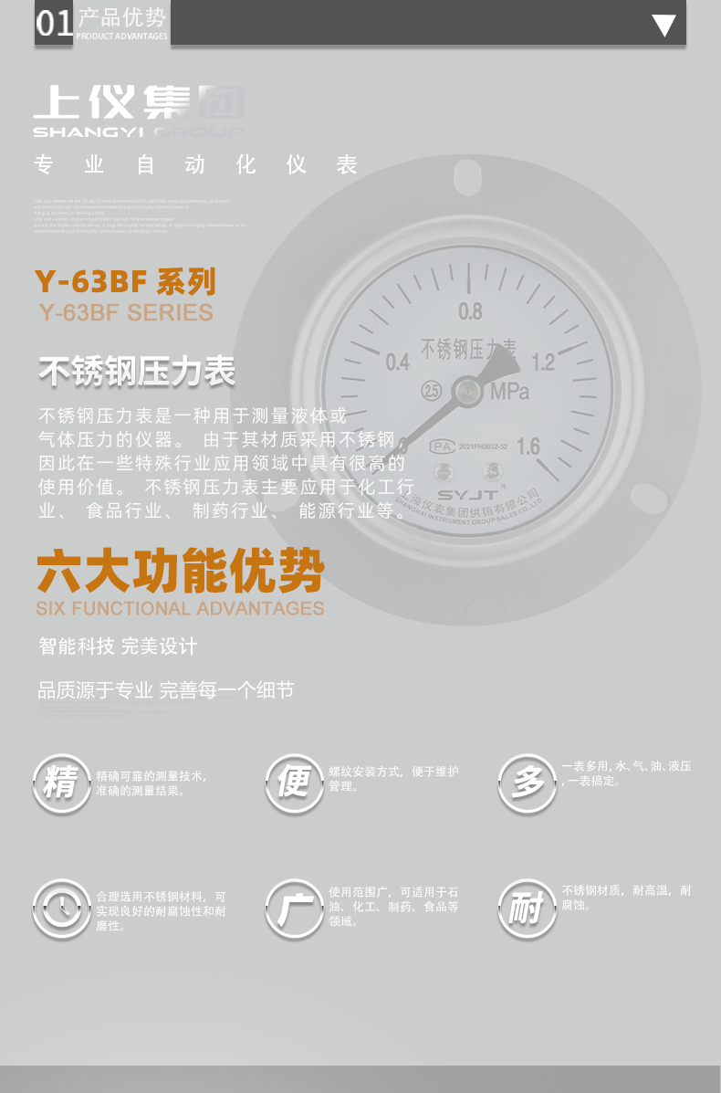 上儀集團Y-63BF軸向帶邊不銹鋼壓力表,不銹鋼壓力表廣泛用于石油、化工、化纖、冶金、電站等工業(yè)部門中對耐腐、抗振有較高要求的工藝流程中測量各種流體介質的壓力。本儀表的整體結構設計合理、工藝精致,具有較高的測量**度和持久的穩(wěn)定性,因此不僅可提供出口,尤為國內用戶對···