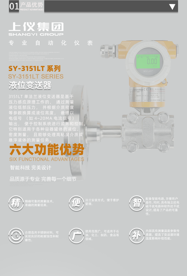 3151LT系列單法蘭液位變送器是一種在工業(yè)自動(dòng)化*域中廣泛應(yīng)用的設(shè)備,主要用于測(cè)量和轉(zhuǎn)換液體、氣體或蒸汽的液位或壓力信號(hào)為標(biāo)準(zhǔn)的電信號(hào)輸出。以下是關(guān)于3151LT系列單法蘭液位變送器的詳細(xì)介紹:一、產(chǎn)品特點(diǎn)測(cè)量范圍廣:3151LT系列單法蘭液位變送器具有廣泛的測(cè)量范圍,通常可···