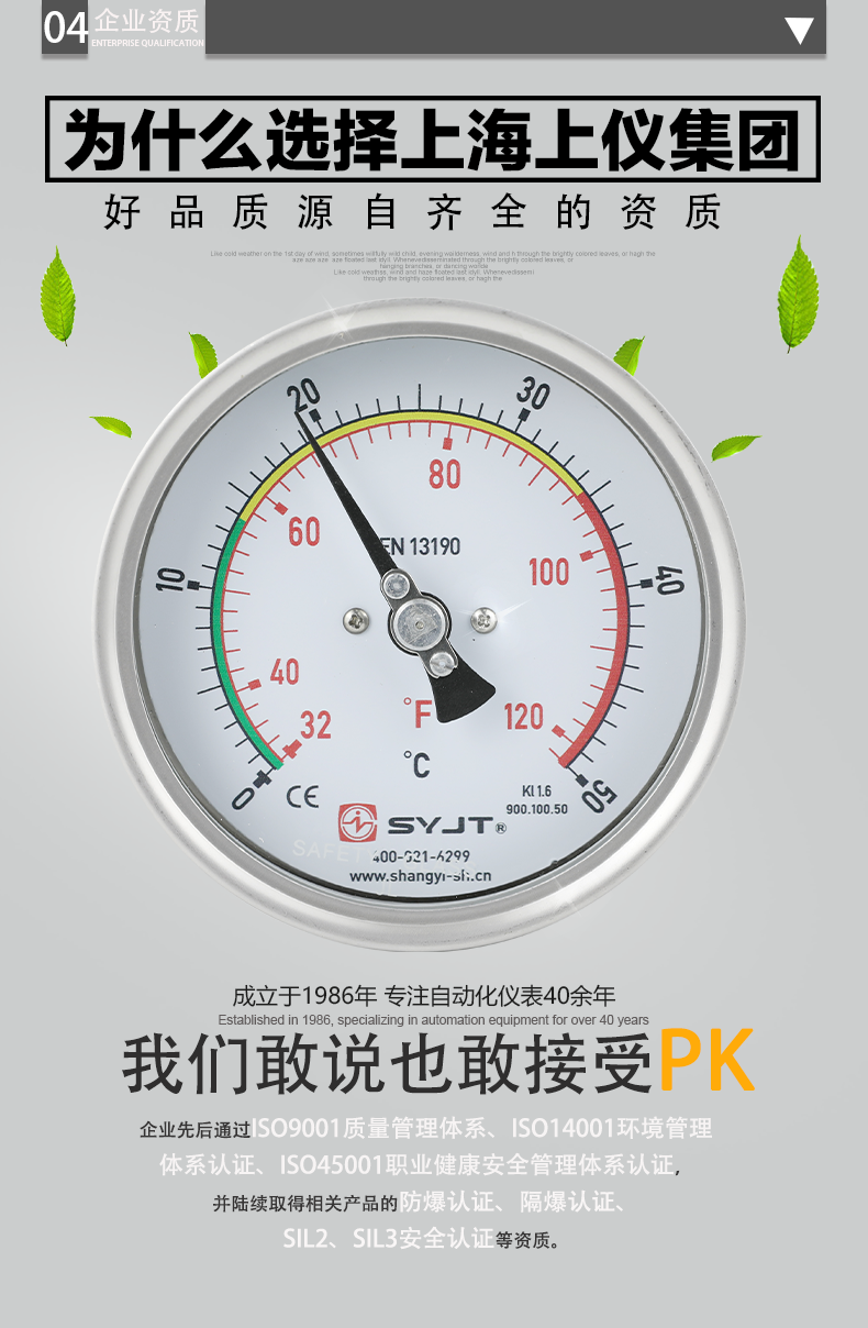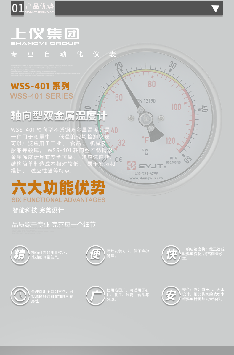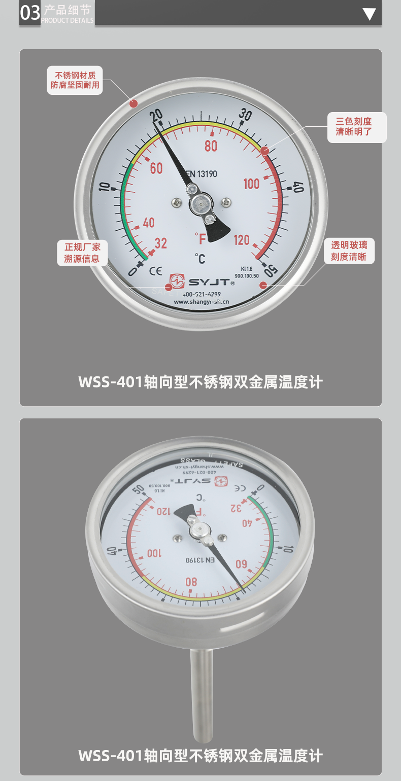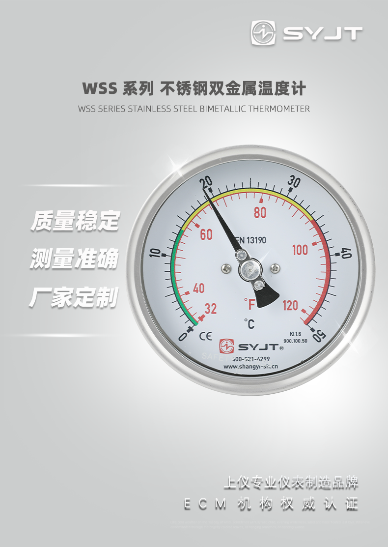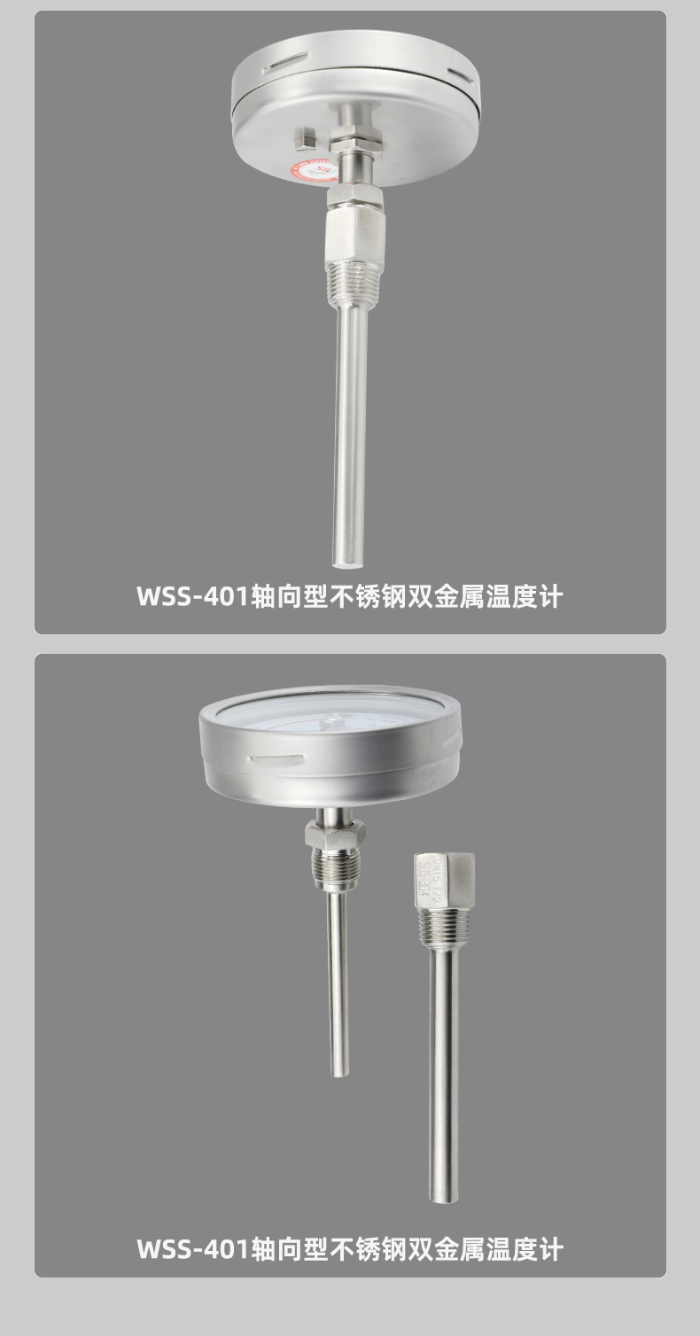 WSS不銹鋼雙金屬溫度計(jì)軸向型,本廠生產(chǎn)的雙金屬溫度計(jì)其保護(hù)管、節(jié)頭、鎖緊螺栓等均采用1Cr18Ni9Ti材料,表殼采用鋁板拉伸成型經(jīng)切削加工表面黑色電泳處理,表蓋與表盒采用環(huán)型雙層橡膠圈螺紋密封鎖緊結(jié)構(gòu),故儀表整體防水防腐性能良好,徑向型儀表采用彎管型結(jié)構(gòu),外型新穎、輕巧···